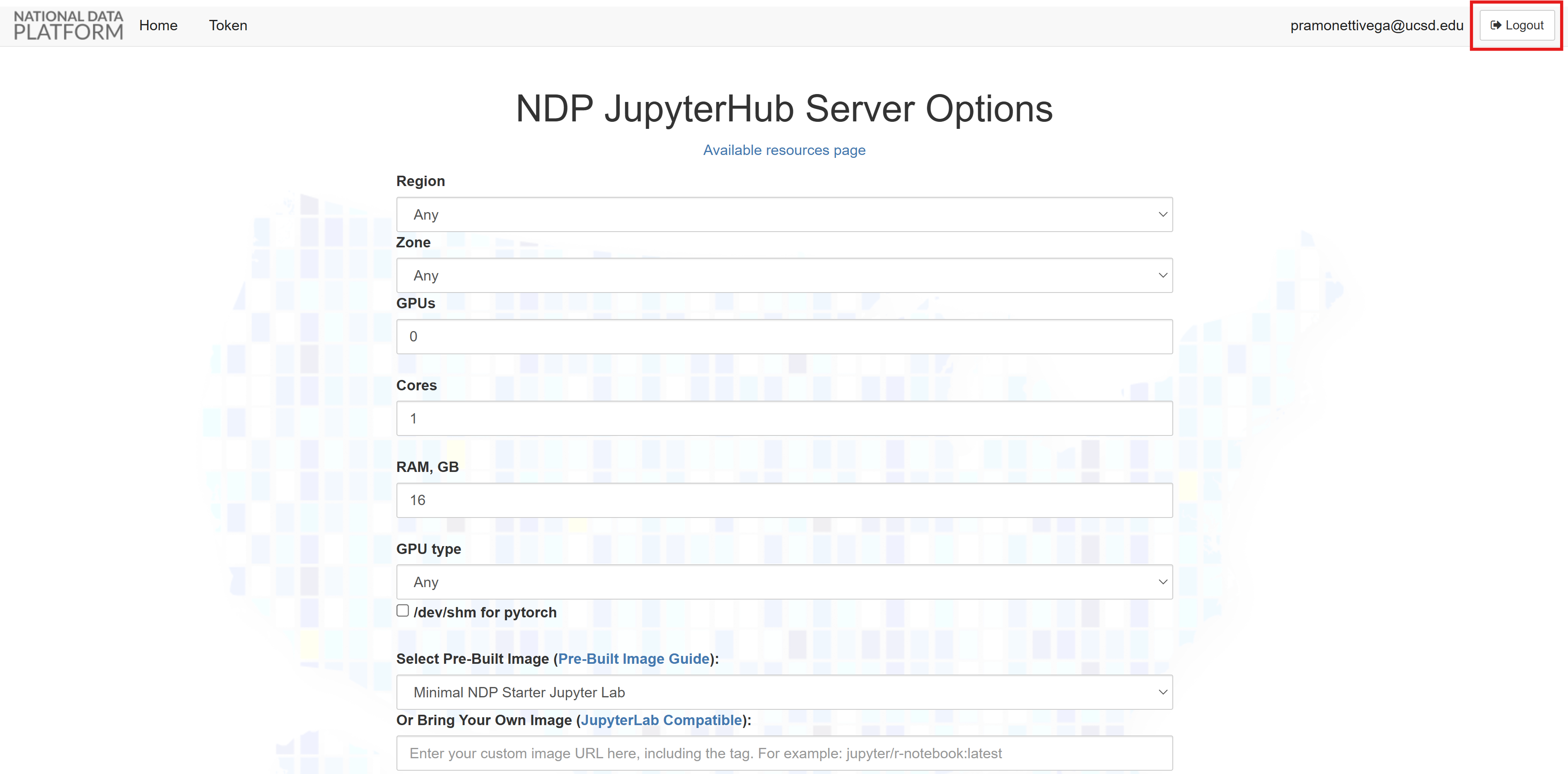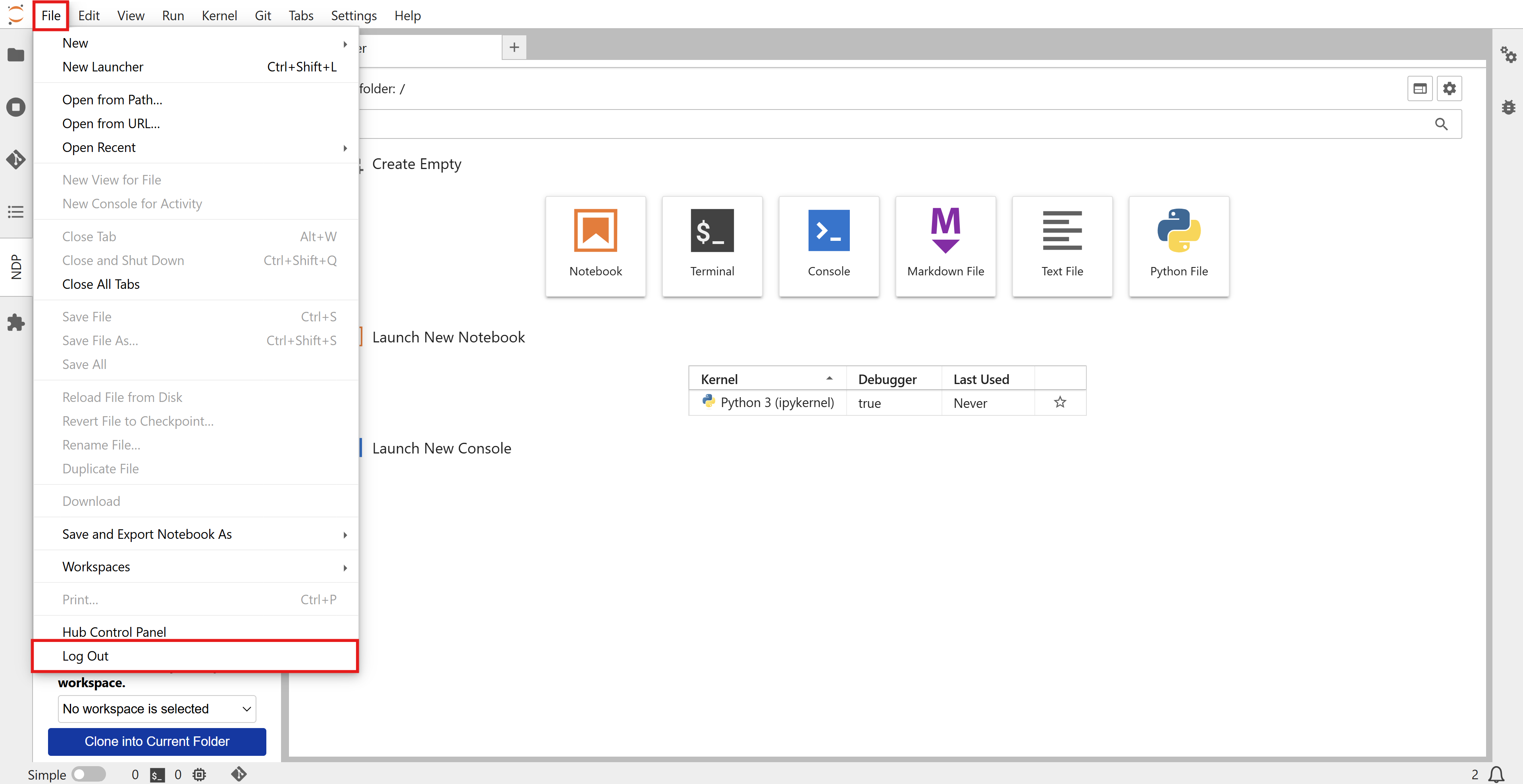 NOTE: You must log out and log in within JupyterHub, not the main NDP site. If you go to the main NDP site to log out and log in again, your JupyterHub access token will not be reset.
