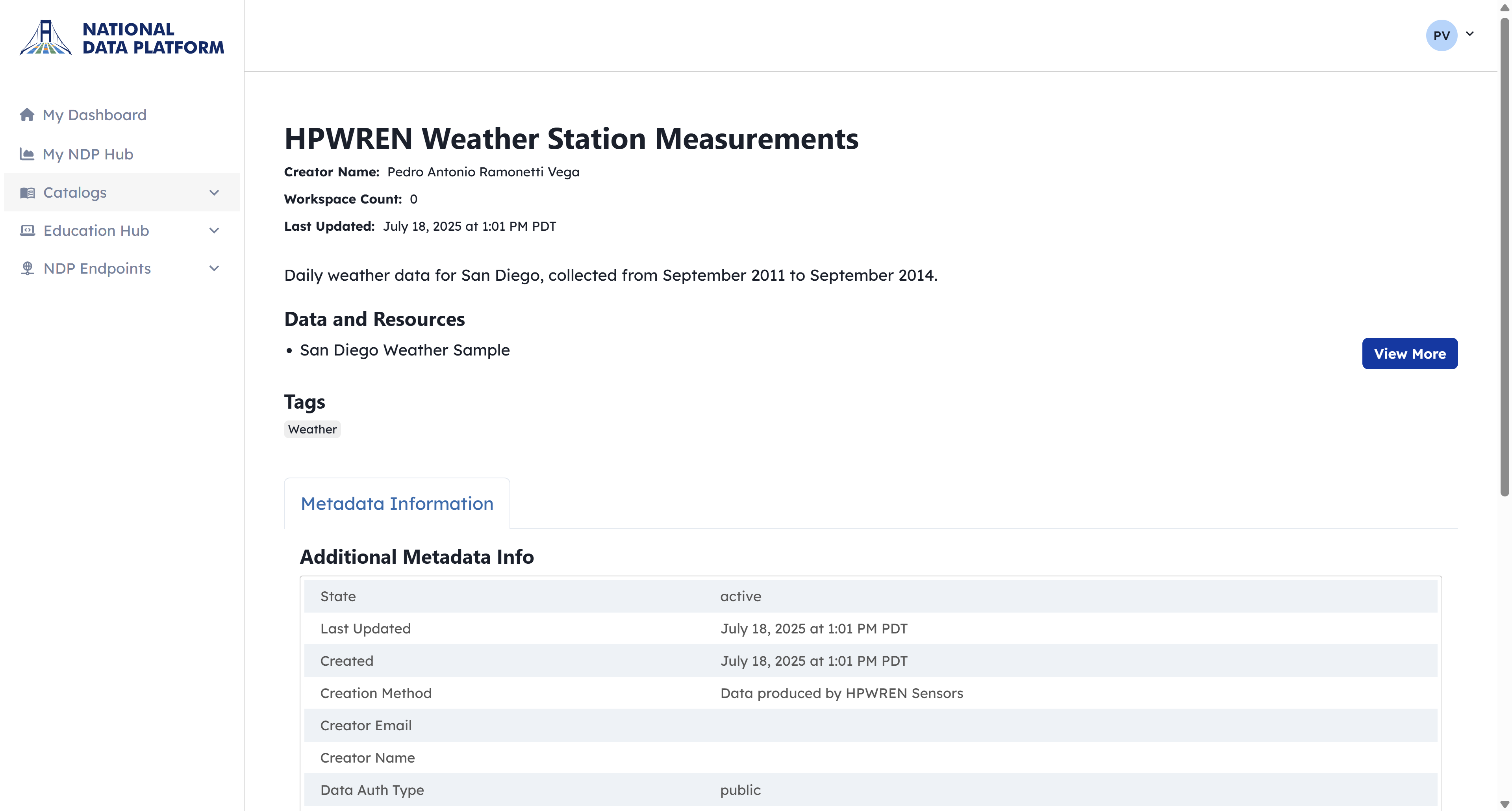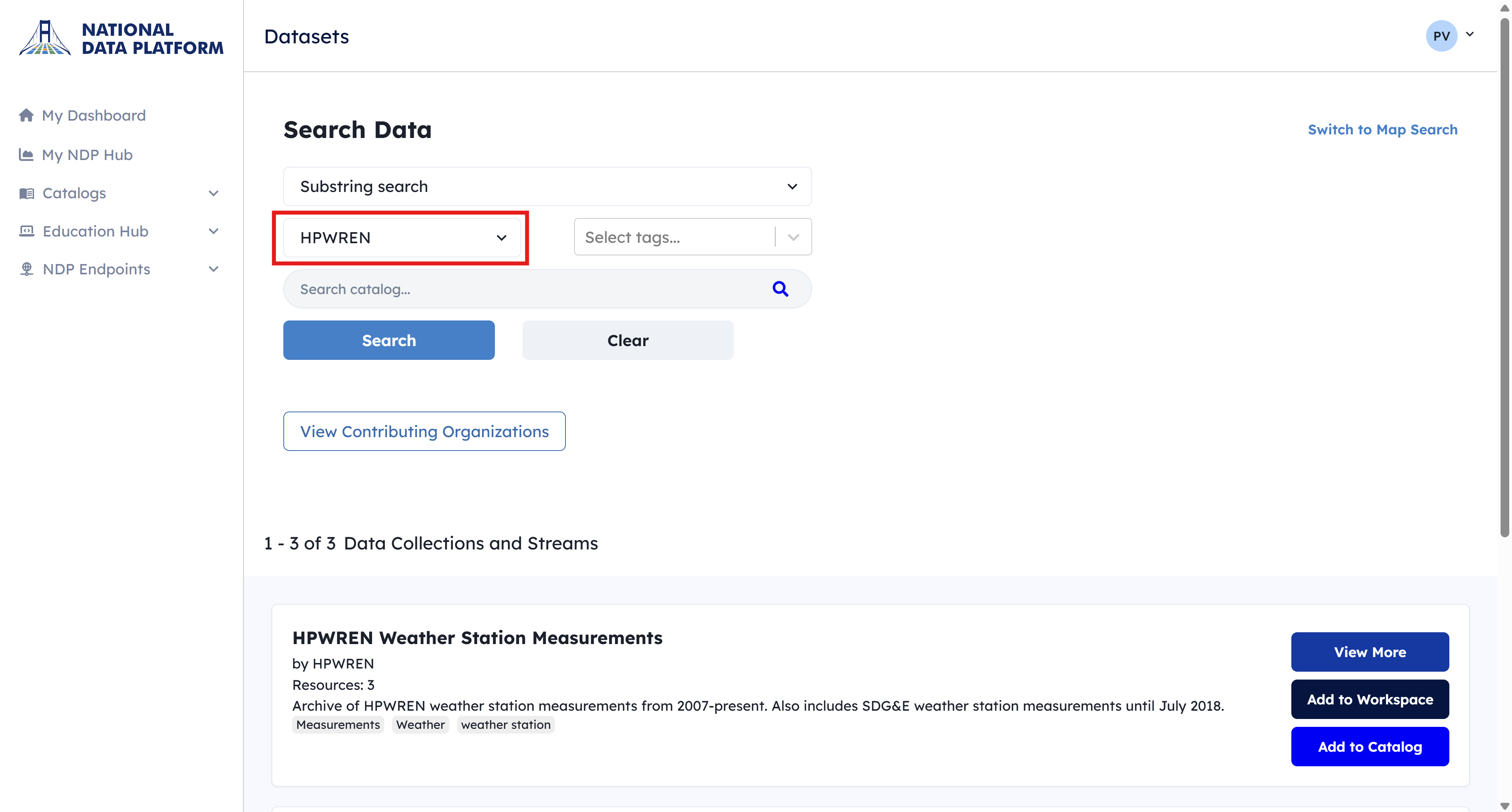 2 - Type HPWREN Weather. You will see a dataset called HPWREN Weather Station Measurements listed first. This is a dataset that we use as part of the Set up Workspace tutorial.