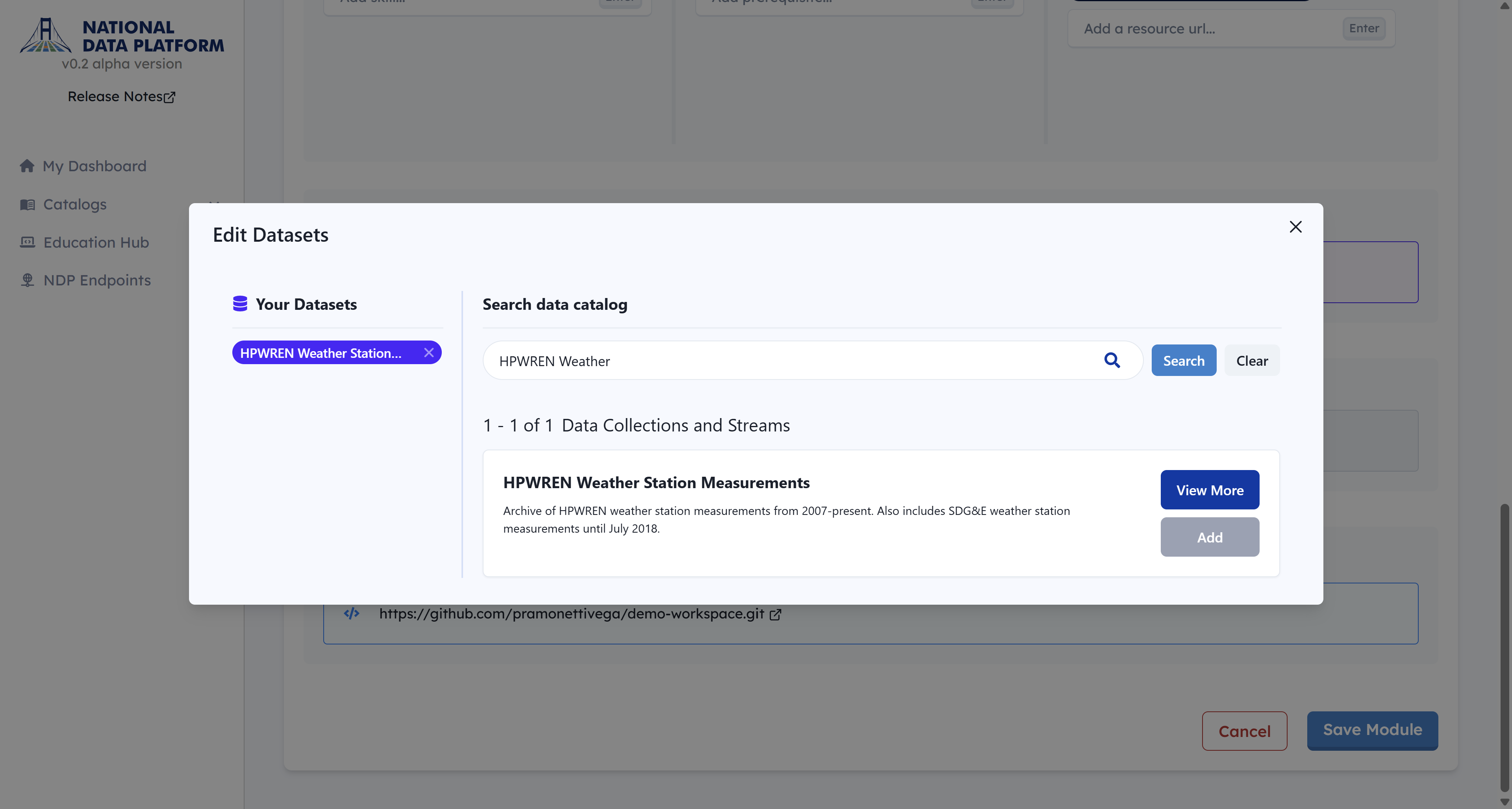 10 - Click Save Module to finalize and save your workspace. You can return at any time to edit your workspace and update its information, datasets, scripts, or resources.