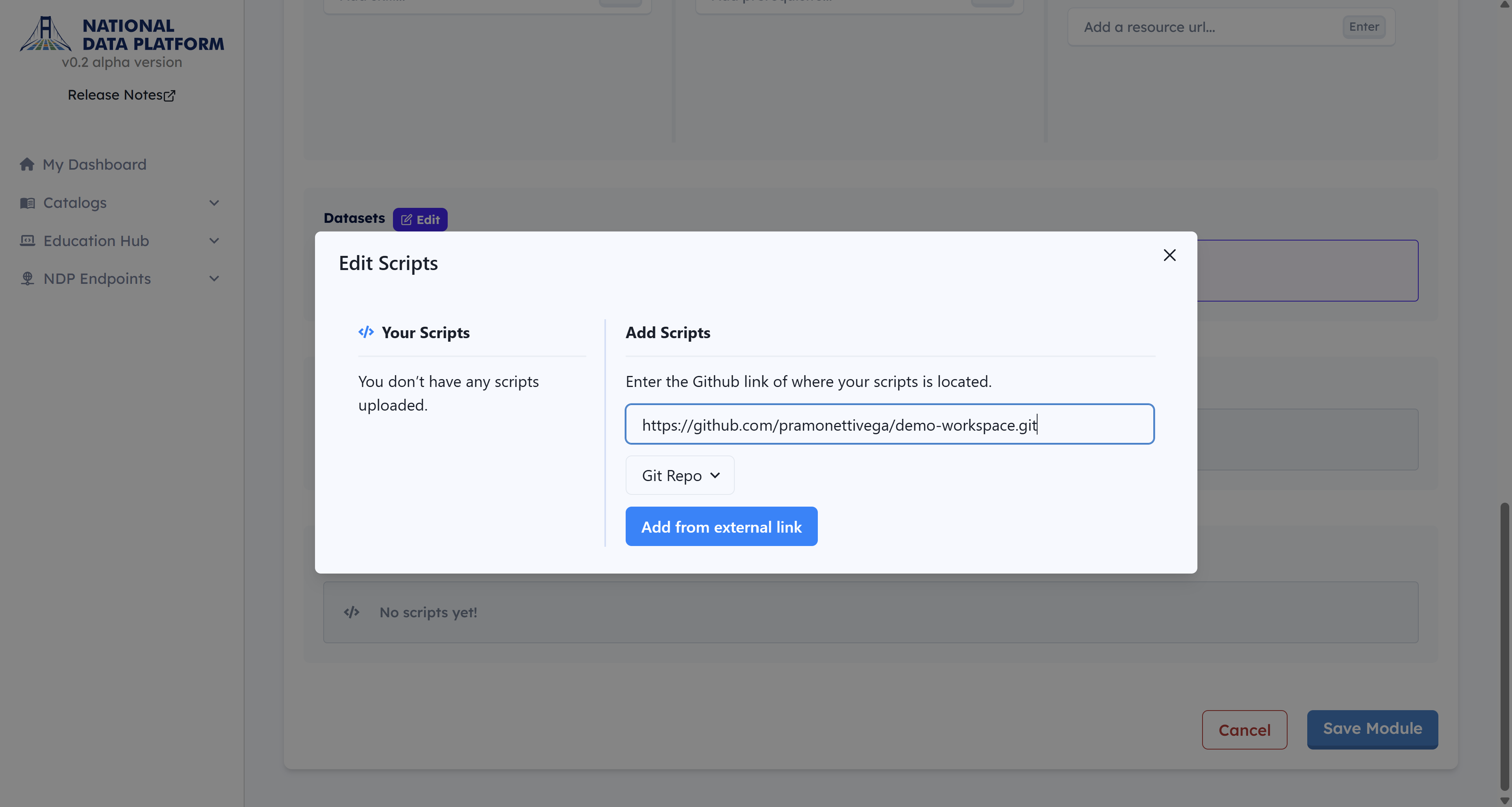 9 - Click the Edit button next to Scripts. Paste the demo GitHub repository URL: https://github.com/pramonettivega/demo-workspace.git. Then click Add from external link. Close the window once the repository is added.