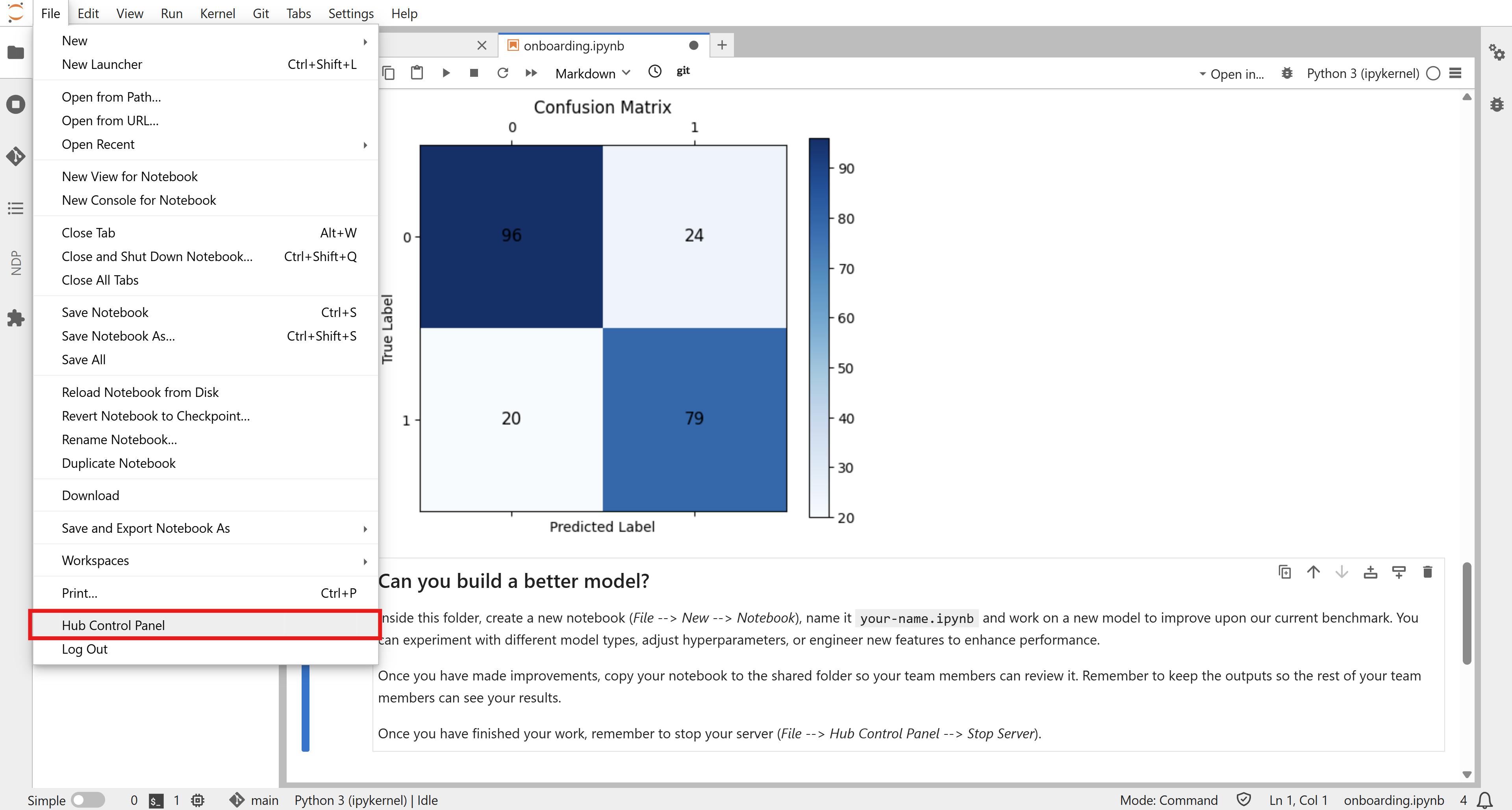 - Go to File (top left corner) → Hub Control Panel → Stop Server to shut down your environment when you're done.